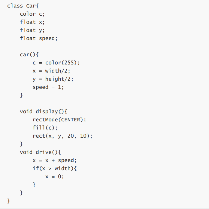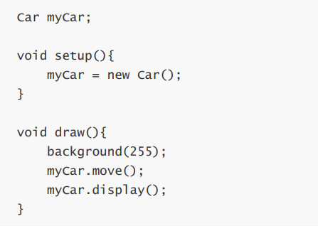 Car myCar = new Car(color(255,0,0), 0, 100, 2);