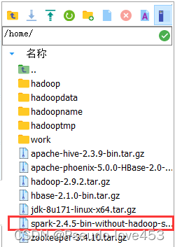 1.上传spark-2.4.5-bin-without-hadoop-scala-2.12文件到master节点的:/home目录下: