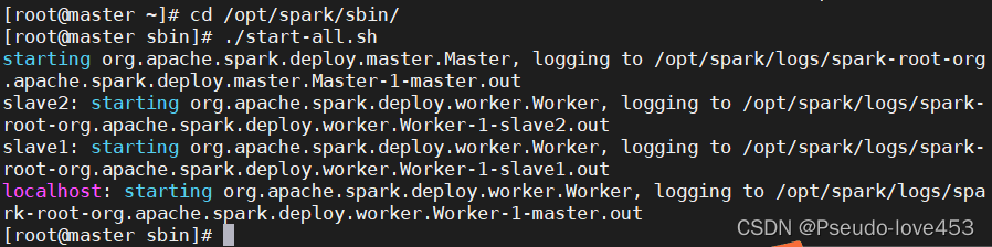 7.登录master节点,分发配置好的spark文件到slave1和slave2节点上: