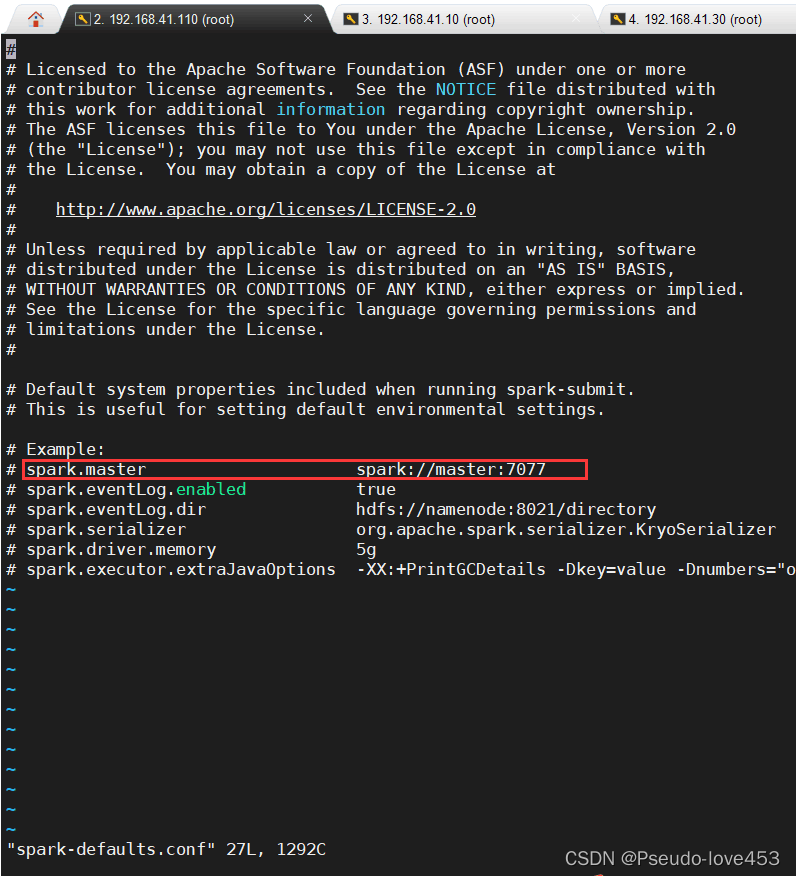 进入:/opt/spark/conf目录下,开始配置文件spark-defaults.conf(系统没有提供spark-defaults.conf文件,需要从spark-defaults.conf.template文件拷贝一份)