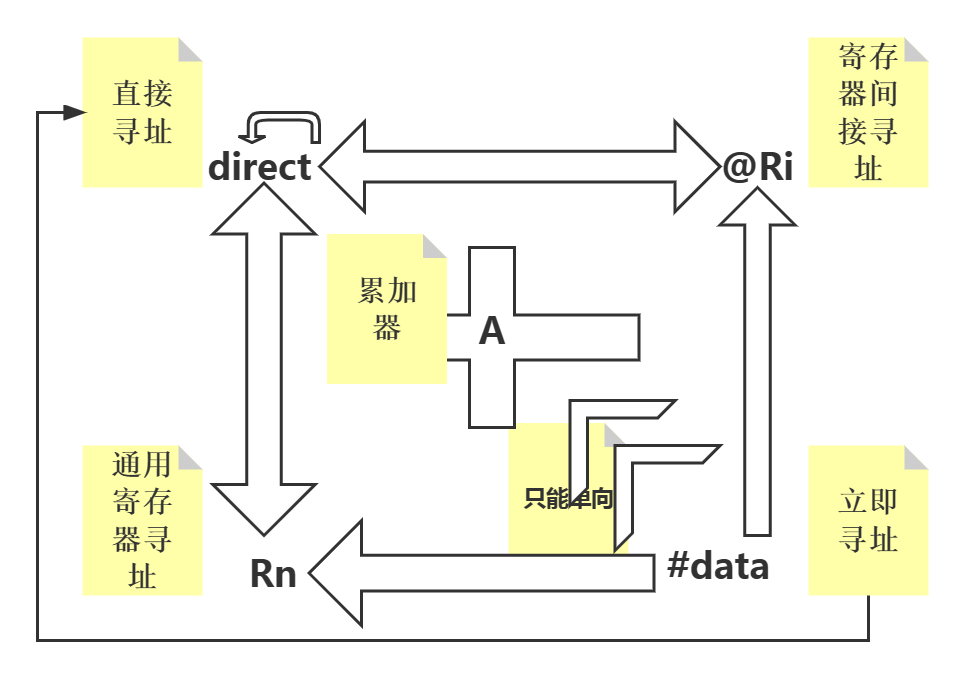 ps:访问SFR的唯一方式。操作码后面的一个字节是实际操作数地址。内部RAM的高128字节。