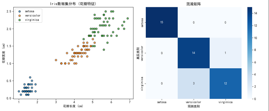 这里我们选择花瓣长度和宽度两个特征进行可视化,可以看到不同种类的鸢尾花在这两个特征上的分布情况,有助于我们理解后续的分类结果。