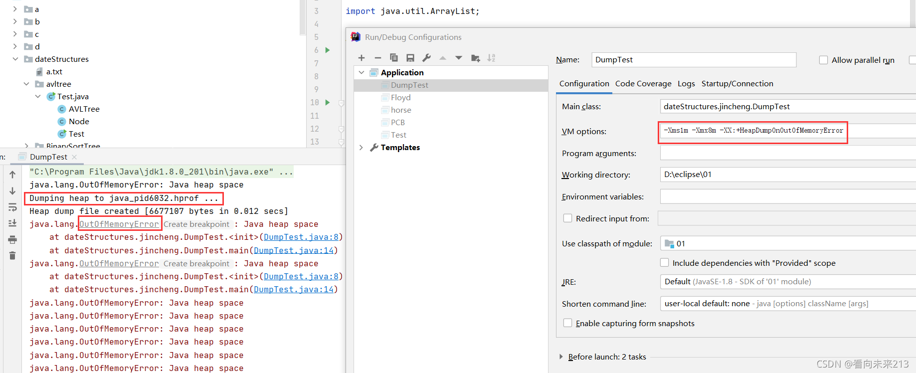 3.在idea中VM参数中写参数 -Xms1m -Xmx8m -XX: +HeapDumpOnOutOfMemoryError