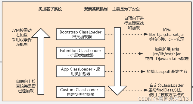 1.类加载器收到类加载的请求 2.将这个请求向上委托给父类加载器去完成,一 直向上委托,直到启动类加载器 3.启动加载器检查是否能够加载当前这个类,能加载就结束, 使用当前的加载器,否则, 抛出异常,通知子加载器进行加载 4.重复步骤3