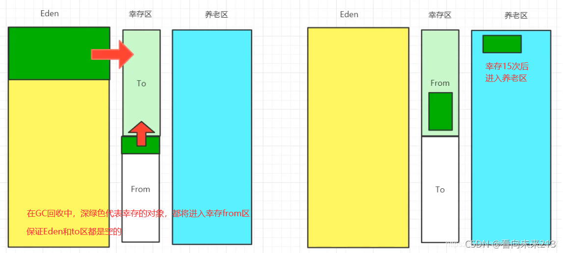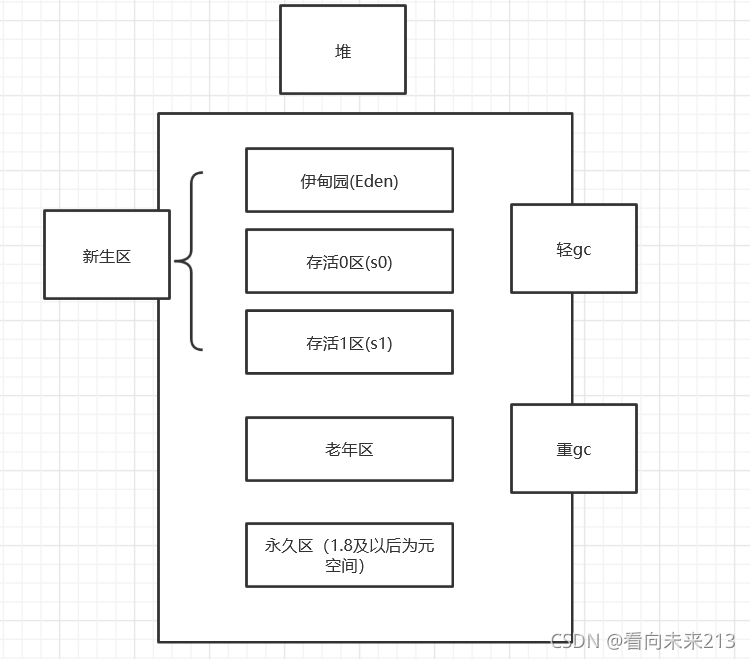 1)新生区 :Eden、S0、S1。对象在这里诞生、成长、甚至死亡