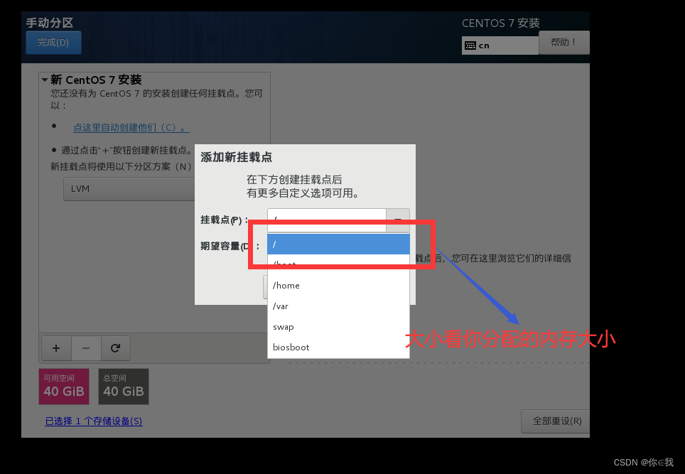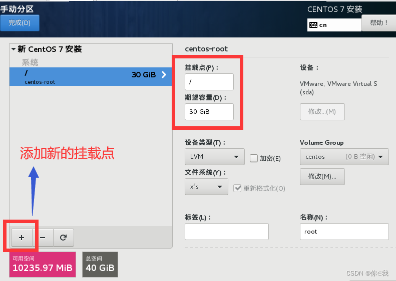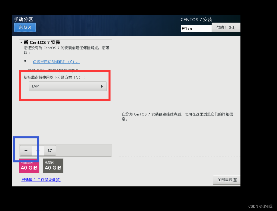17.分区方案选择LVM,然后下面选择“+”设置分区