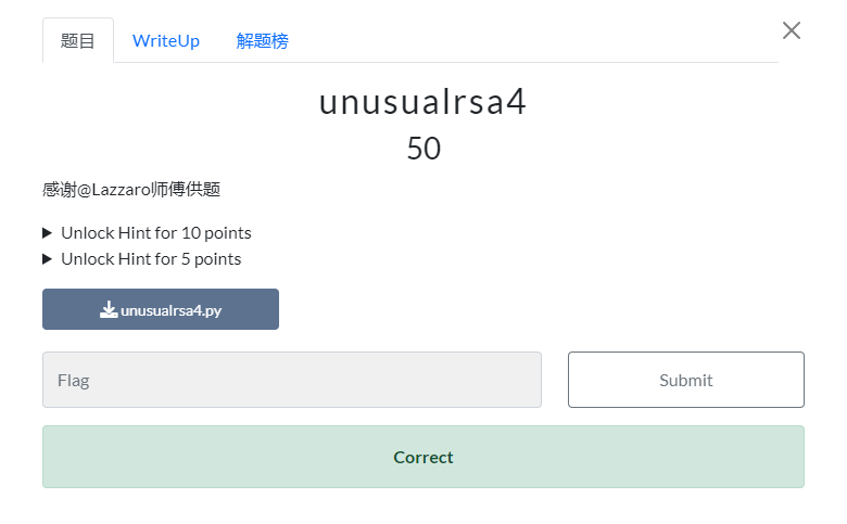 funnyrsa1-ctf.show(e与phi不互素) 这里解出来的也是m^14,与上面不同的是,这里就一个,当然,这里依旧不能直接开方求,原因和上面一样,这里把14分成2*7,将m^2看成整体m,所以这里的e就成了7,求7在(q1-1)*(q2-1)下的逆元,也就是d,常规rsa即可解出flag。这里我一开始是直接将结果m1,m2开14次方,然后输出flag,但发现行不通,我个人认为应该是开方不完全的原因,换句话说,就是m1,m2开14次方不是整数,python里对其取了整数部分,但转字符会出问题。这里可以利用中国剩余定理,结合c1,c2求出特解c。