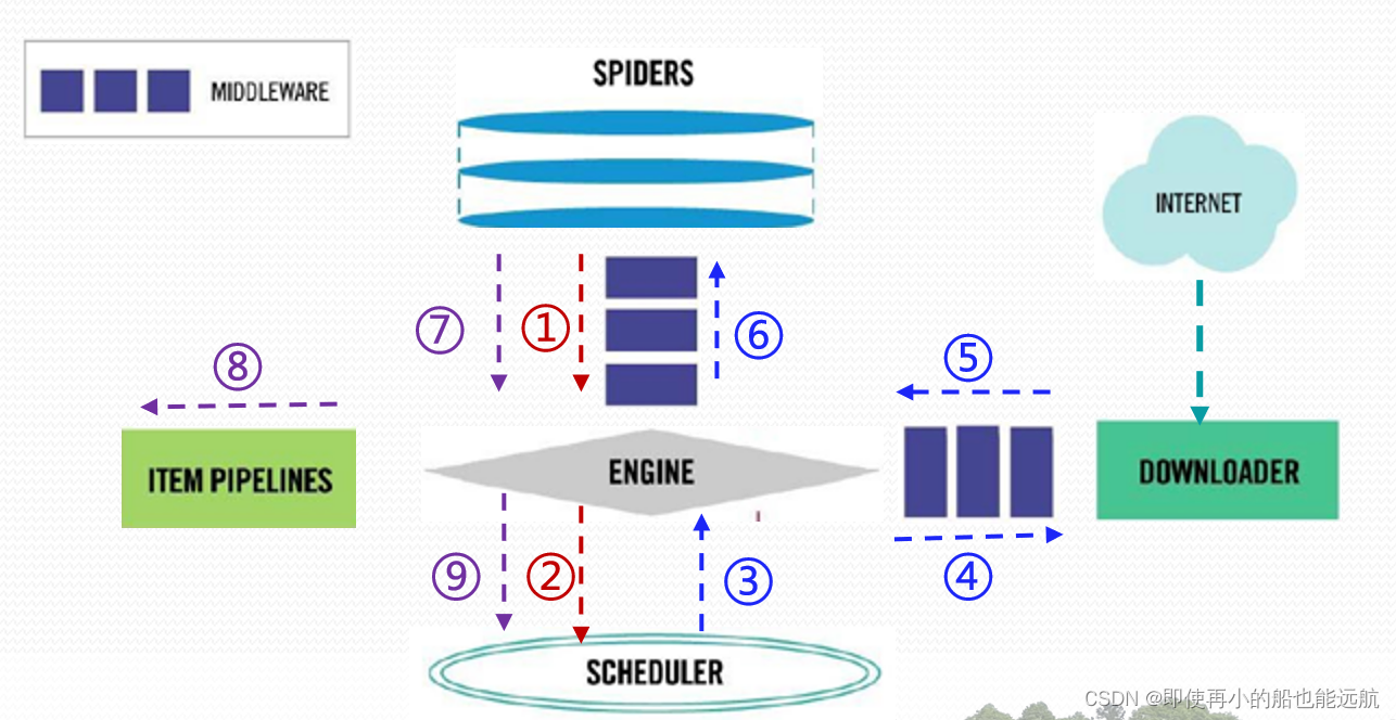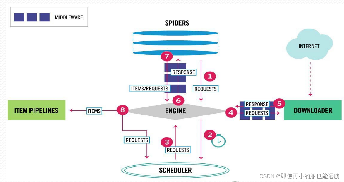 Engine控制各模块数据流,不间断从Scheduler处获得爬取请求,直至请求为空 。