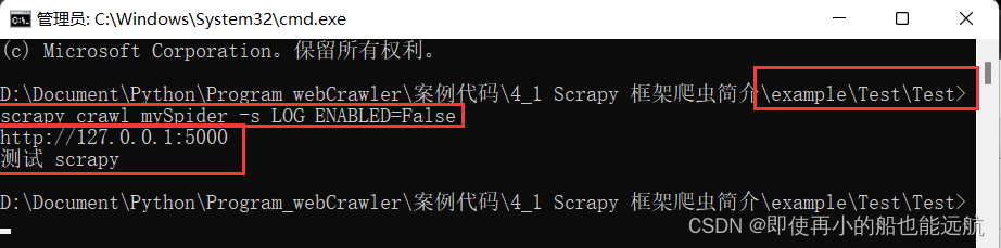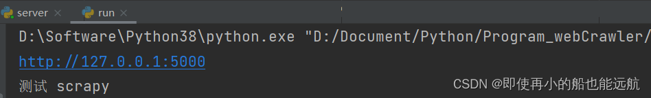 这个程序建立好就可以执行了,建立 http://127.0.0.1:5000 的网站,访问这个网站返回 “测试 scrapy”。