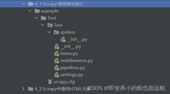 (2)Scrapy项目建立后会在D:\example中建立Test文件夹,同时下面还有另外一个Test子文件夹,如下图所示(将这个项目移到4_1 Scrapy 框架爬虫简介下,用PyCharm打开)