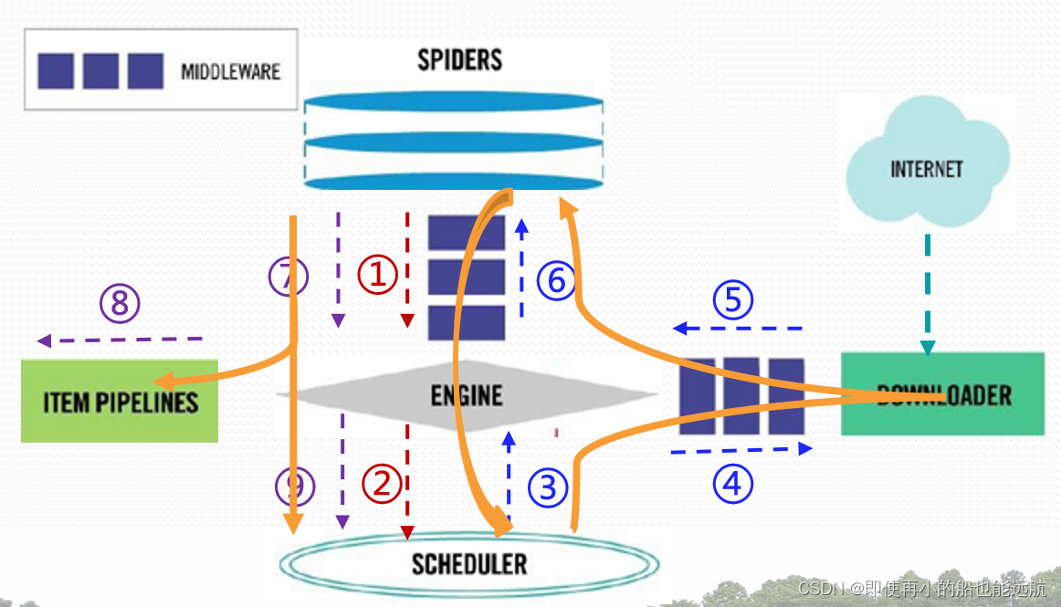 ⑨ Engine将爬取请求发送给Scheduler。