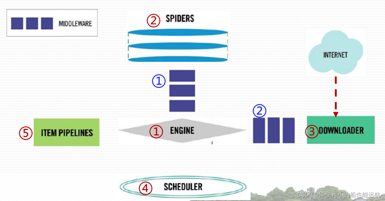 ⑤Downloader形成响应(Response) 通过中间件发给Engine。