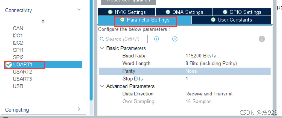 3基础参数:波特率为115200 Bits/s。传输数据长度为8 Bit。奇偶检验无,停止位1 接收和发送都使能