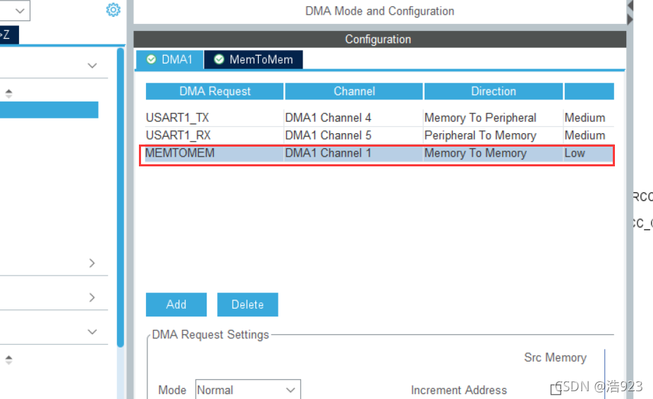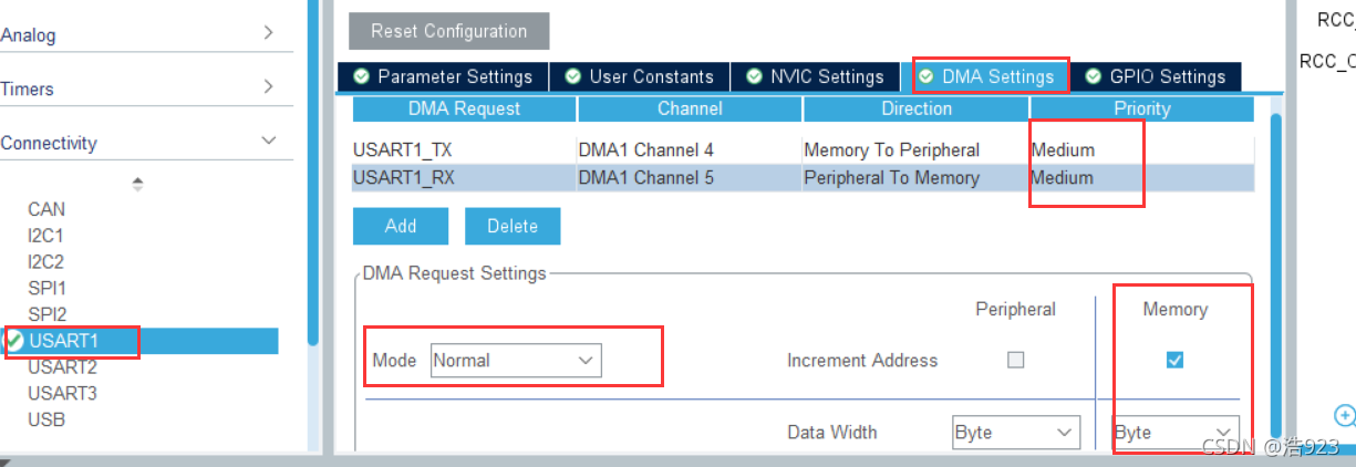 根据DMA通道预览可以知道,我们用的USART1 的TX RX 分别对应DMA1 的通道4和通道5