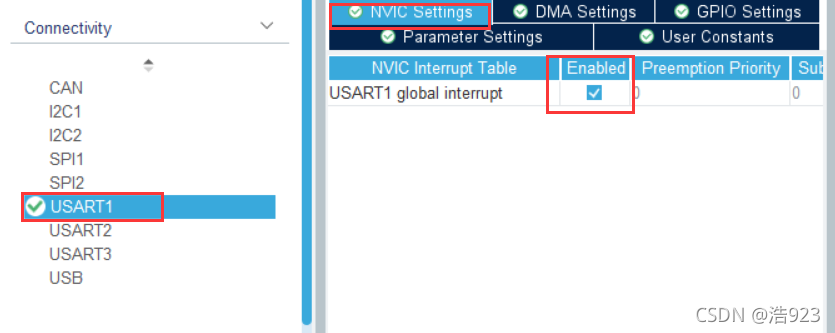 NVIC Settings 一栏使能接收中断