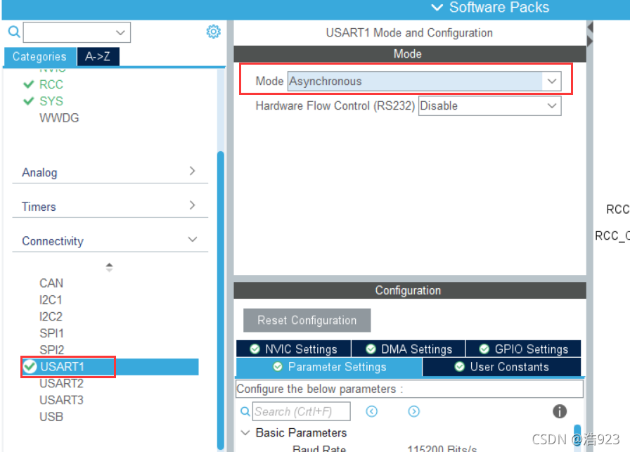 设置MODE为异步通信(`Asynchronous`)