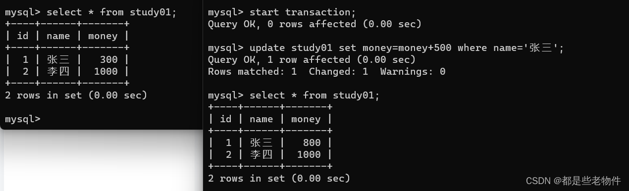 另外打开一个cmd查询到的字段money是不变的还是800,这说明没有提交之前,数据是不会发生改变的。