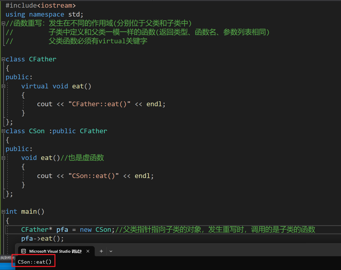 在不同的作用域(分别位于父类和子类中)子类中定义和父类一模一样的函数(返回类型、函数名、参数列表都一样),父类函数必须有virtual关键字