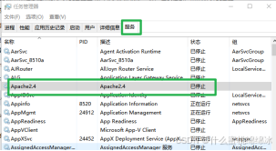 执行命令1,启动Apache服务 - 安装完成后,可以在任务管理器->服务看到Apache2.4服务如果未运行请启动Apache2.4服务