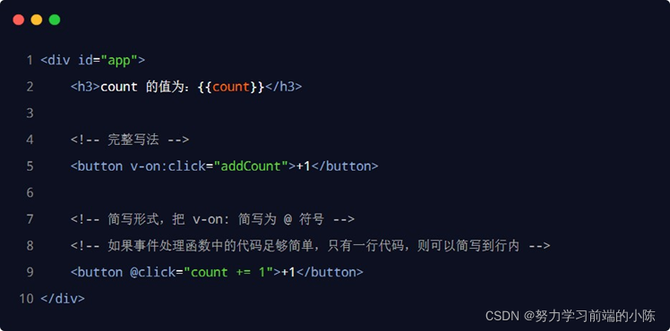 注意:原生 DOM 对象有onclick、oninput、onkeyup 等原生事件,替换为vue 的事件绑定形式后,