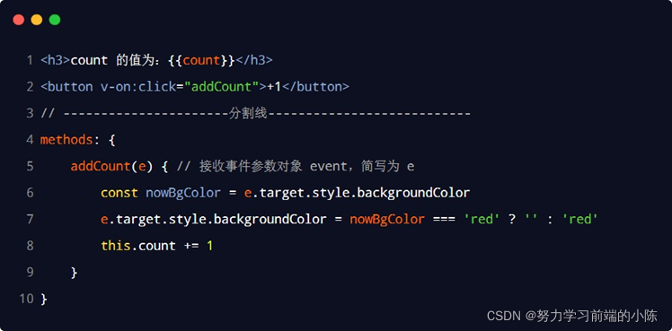 (简写为@ )所绑定的事件处理函数中,同样可以接收到事件参数对象event,示例代码如下: