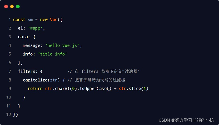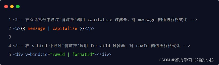 过滤器应该被添加在 JavaScript 表达式的尾部,由“管道符”进行调用,示例代码如下: