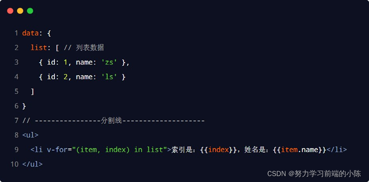 注意:v-for 指令中的 item 项和 index 索引都是形参,可以根据需要进行重命名。例如(user, i) in userlist