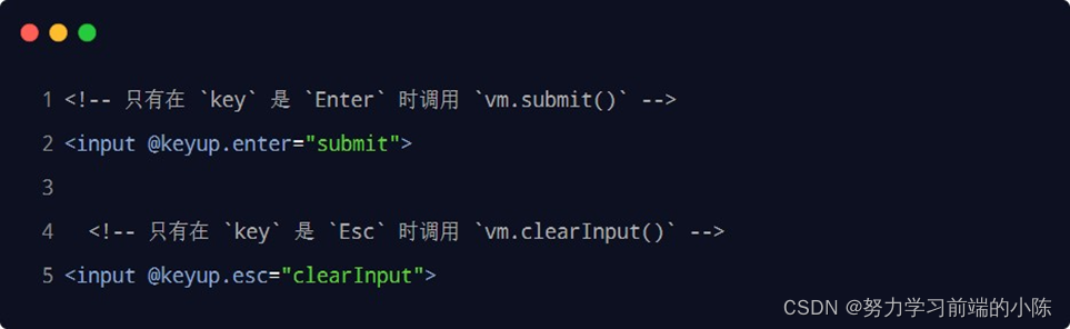 在监听键盘事件时,我们经常需要判断详细的按键。此时,可以为键盘相关的事件添加按键修饰符,例如: