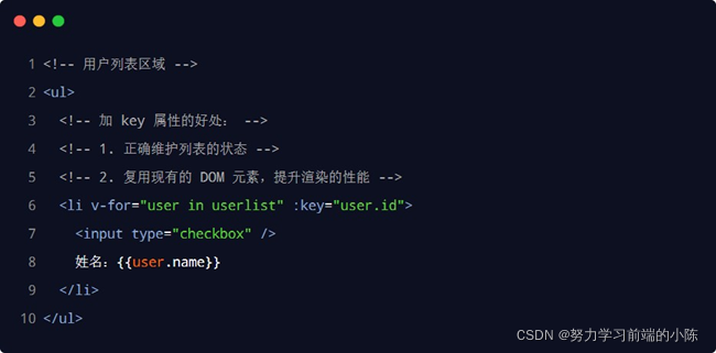当列表的数据变化时,默认情况下,vue 会尽可能的复用已存在的 DOM 元素,从而提升渲染的性能。但这种 默认的性能优化策略,会导致有状态的列表无法被正确更新。