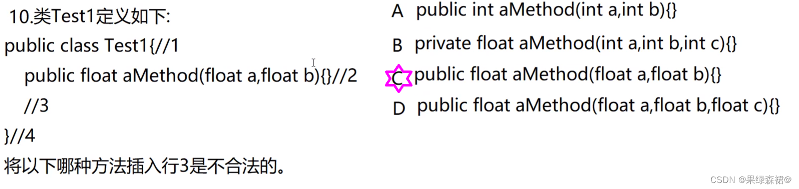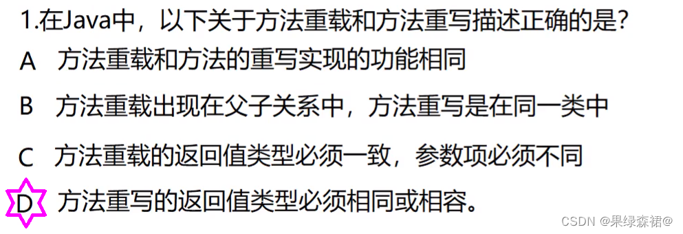 方法重载:在一个类中定义了若干个方法名称相同,参数个数或类型不同的一组方法,与返回值无关