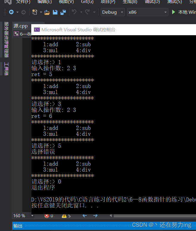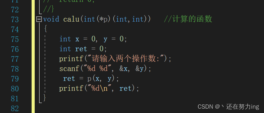例如加法运算,把add函数的地址传给calu函数,用函数指针接收,然后运行calu函数,p就是一个代号,传add过去,p就是add,传sub过去,p就是sub,类比一下,然后ret的值等于调用工具人加法函数之后计算的值。减法同理可得,每次都这样运算,这样大大减少了,程序代码的繁琐程度。