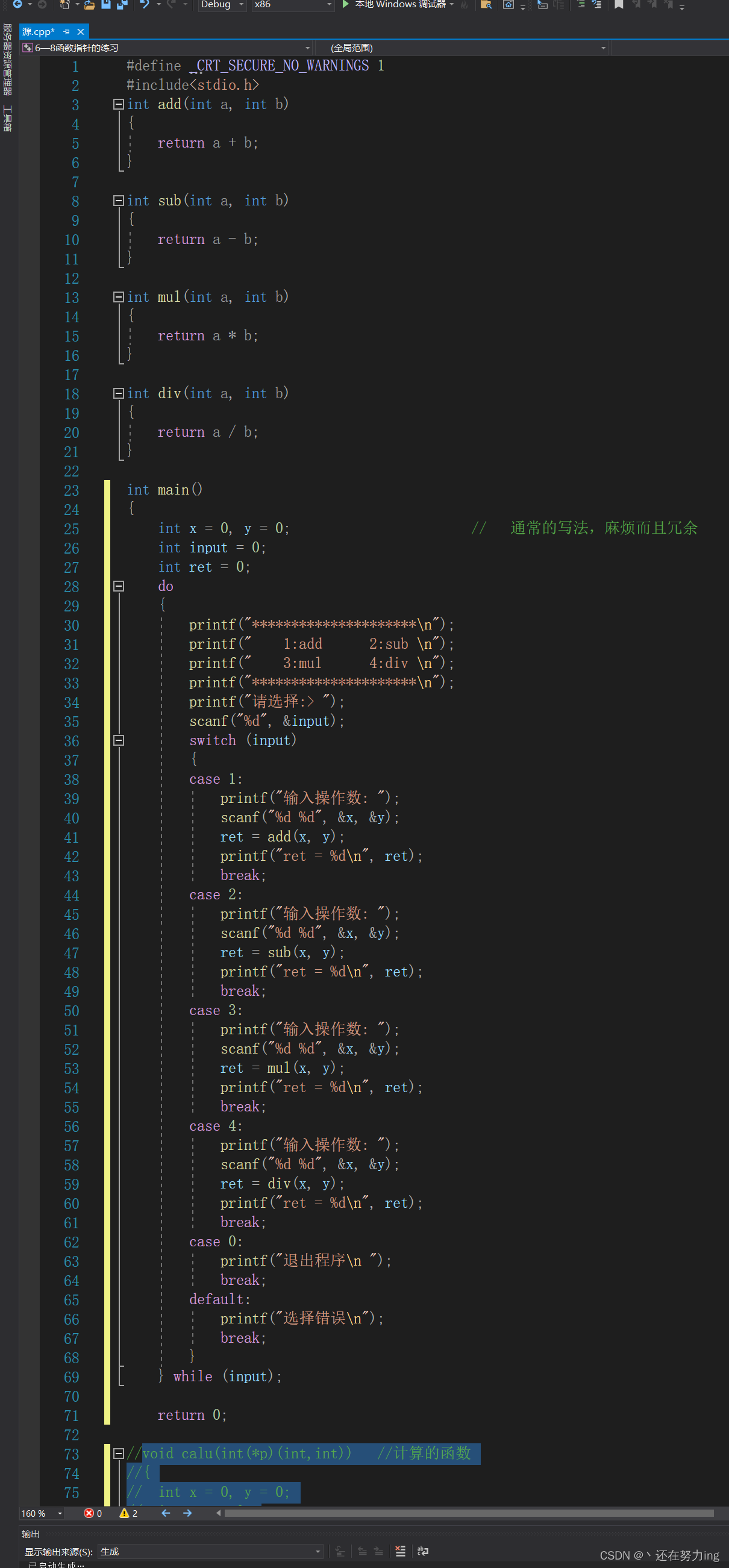 说一下思路:先写一个计算的函数,形参是函数指针,每次传参,把工具人函数,加减乘除的函数地址传过去,函数名可以理解就是函数地址。