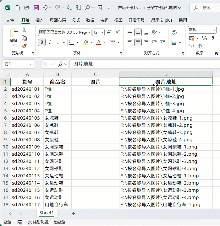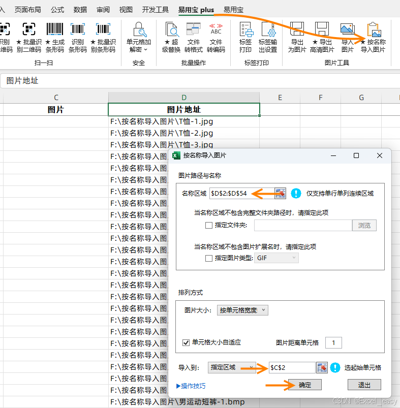 单击Excel易用宝plus,按名称导入图片,浏览名称区域,图片大小选择按单元格宽度,导入到指定区域选择存放图片的第1个单元格,单击确定。