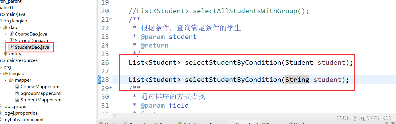 但是如果你只是在Dao接口里面重载了,在xml映射文件的id只调用了一个dao接口的一个方法,是能执行的。在测试类里面是可以调用Dao接口里面的两个重载后的方法。