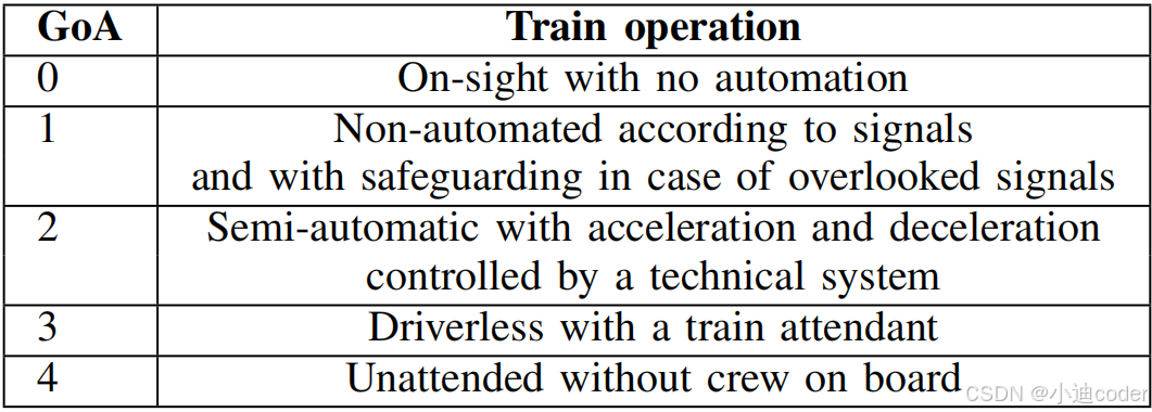上述表格提供了自动化列车操作(ATO)不同自动化等级(GoA)的简化描述。GoA代表“自动化等级”(Grade