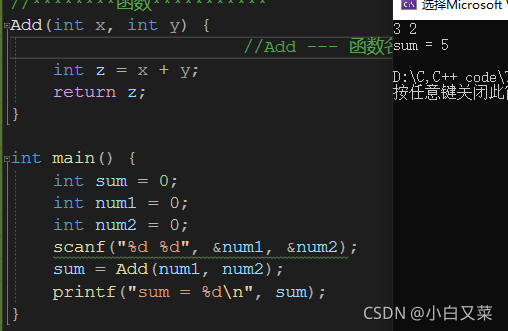 int sum = Add(3, 5); Add --- 函数名 x,y ---形式参数