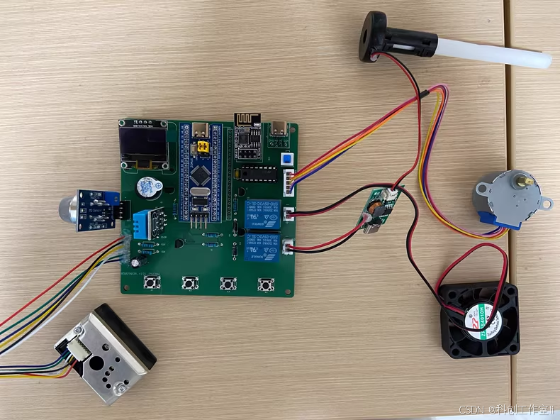 风扇控制:通过继电器控制风扇的开关状态,当环境温度过高或烟雾浓度超标时自动开启风扇,促进空气流通。