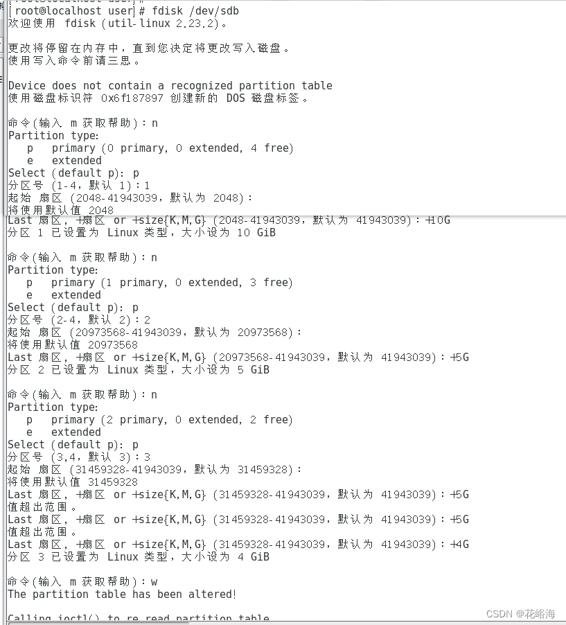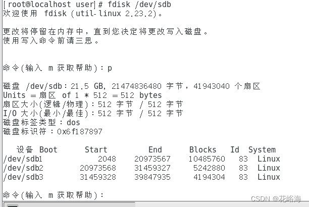 步骤2 利用fdisk 命令对、dev/sdb进行分区