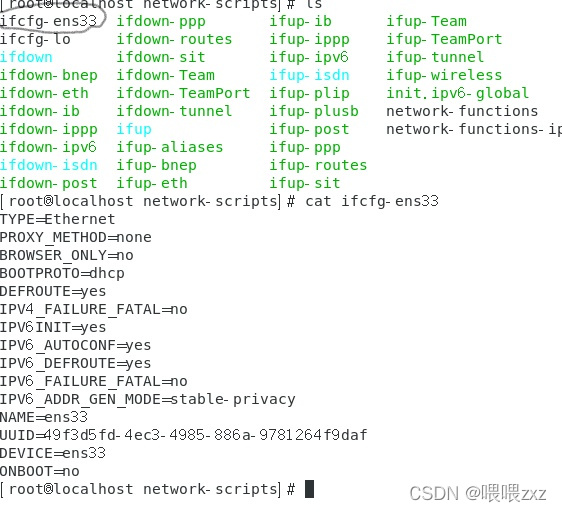 一.#su root进入root用户,#cd /etc/sysconfig/network-scripts,然后#ls查看网卡配置找到ifcfg-ens33网卡名称(一般是ifcfg-开头的为自己的网卡名称),在输入#cat ifcfg-ens33(自己的网卡名称根据个人的情况来看)二.zai输入#vim ifcfg-ens33修改网卡配置(可以是vi)步骤:1.vim文件名(网卡名称)打开文件 2.输入i进入编辑模式 3.输入esc退出 4.输入:进入底行模式 5.输入wq保存退出 D