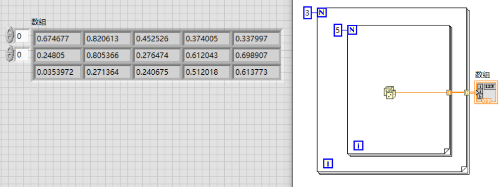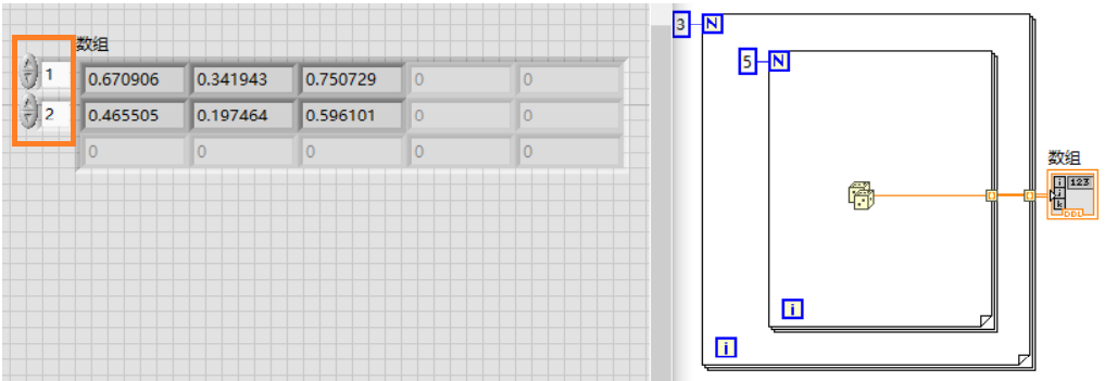 这样就创建了一个数值输入的一维数组。接下来可以通过程序来创建数组,通常使用的是for循环,因为for循环的默认输出是索引,因此只需要连接数组显示控件即可。