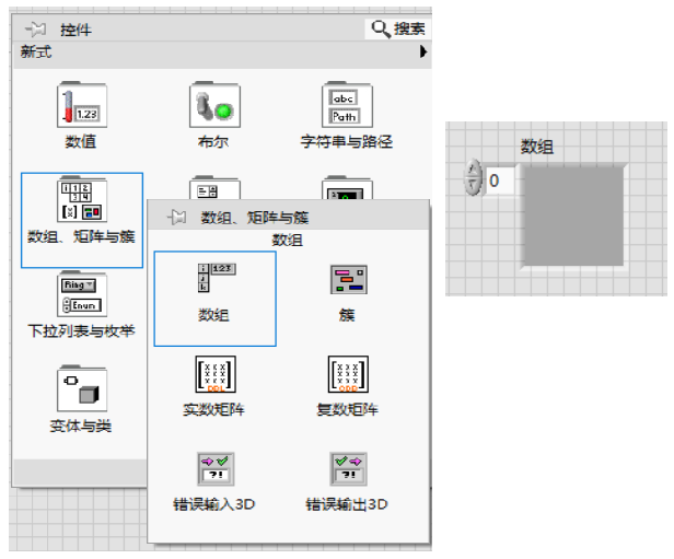 1)在前面板界面选择数组,并放置;