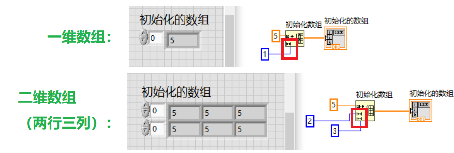 首先,可以直接在前面板中创建二维或者多维数组,通过放置数组,直接对左侧增量下拉,创建多维数组,如下图所示。