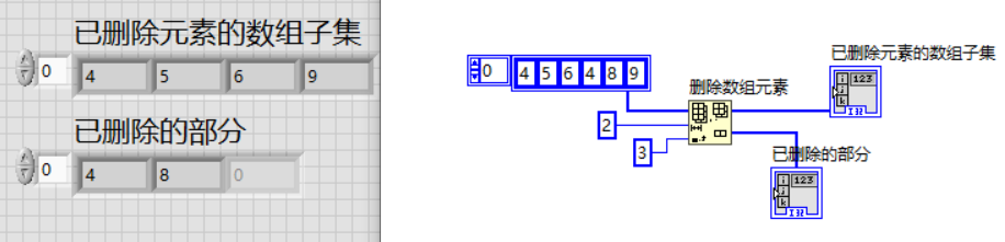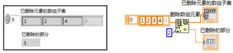“长度”端口默认长度为1,索引为2即删除数组中2号下标所在位置的元素,并将新的数组和删除部分返回。当设置“长度”为2时,则删除所在下标开始的两个元素。