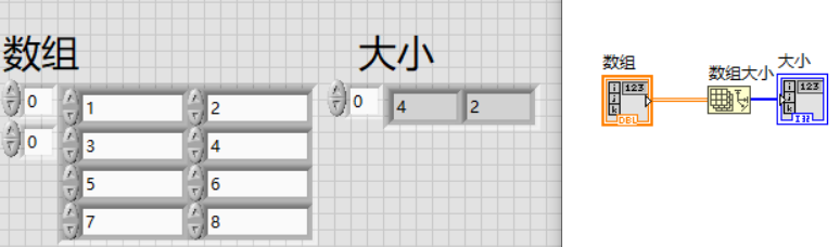 在“数组大小”的输出端直接创建显示控件,可以看到输出数组大小为4行2列。