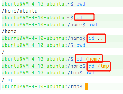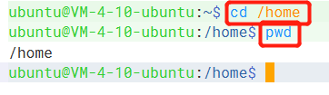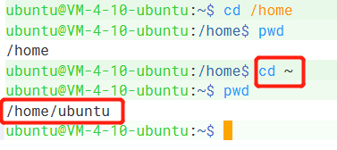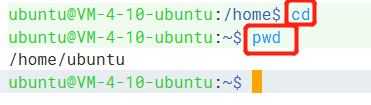 通过 cd 命令可以直接回到工作目录:/home/ubuntu,通过 pwd 命令打印当前目录。