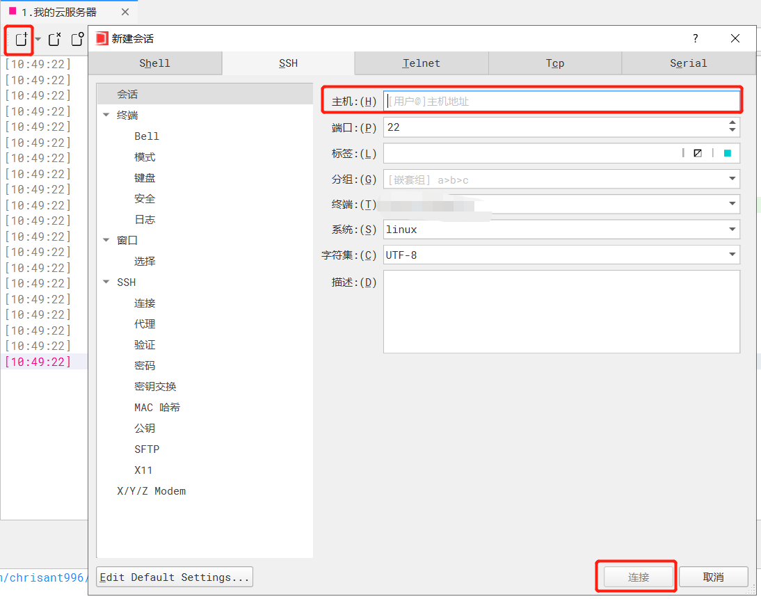 在 “主机” 一栏输入:ubuntu@公网ip,然后根据提示输入密码。