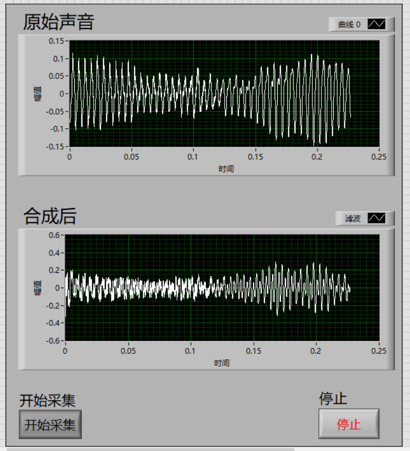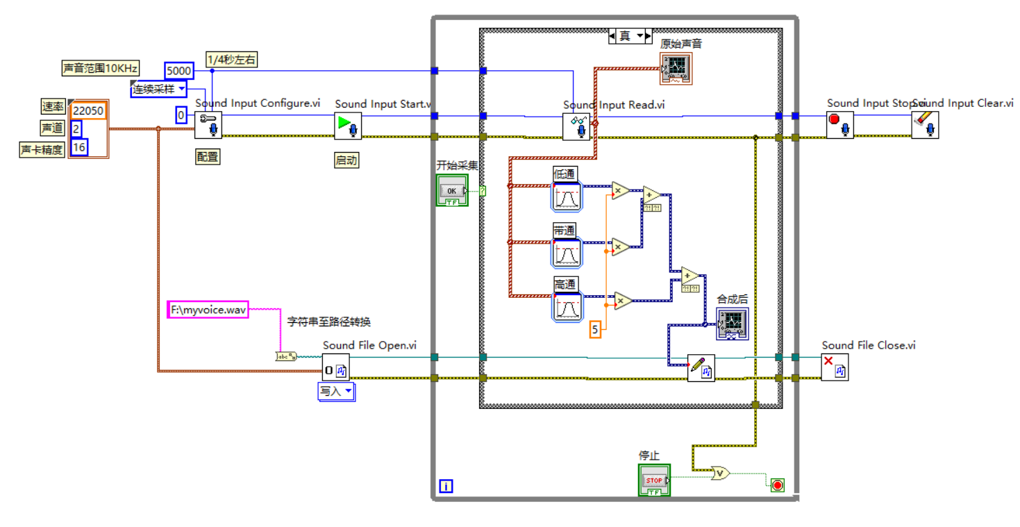 通过声音函数中的”输入“函数,调用”配置声音输入“、“启动声音输入采集”、”获取声音输入“、”停止声音输入采集“、”声音输入清零“实现对声音信号的采集。将“获取声音输入”函数节点放在条件结构中,设置分支选择器为确定按钮,实现当按钮按下时开始采集声音,将声音保存至 wav 文件中。通过滤波器函数和乘函数实现对于采集的声音进行低频段、中频段、高频段分别进行适当的比例放大(乘以5),最终进行合成后(相加)输出并保存。再通过“打开声音文件”设置声音文的保存路径,在 while 循环中实现“写入声音文件”,最后通过”关闭声音文件“结束操作。