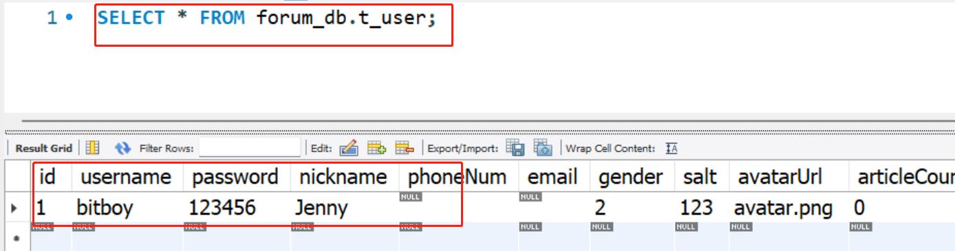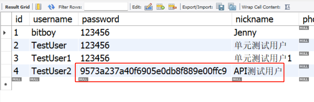 可以看到通过前端界面进行注册后,数据库中正确增加了一条数据。