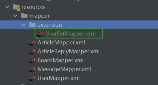 为了避免在自动生成时重复生成相同的语句,我们在 mapper 包下,新建一个 extension 包,将 UserMapper.xml 文件重新复制一份,并重命名为:UserExtMapper