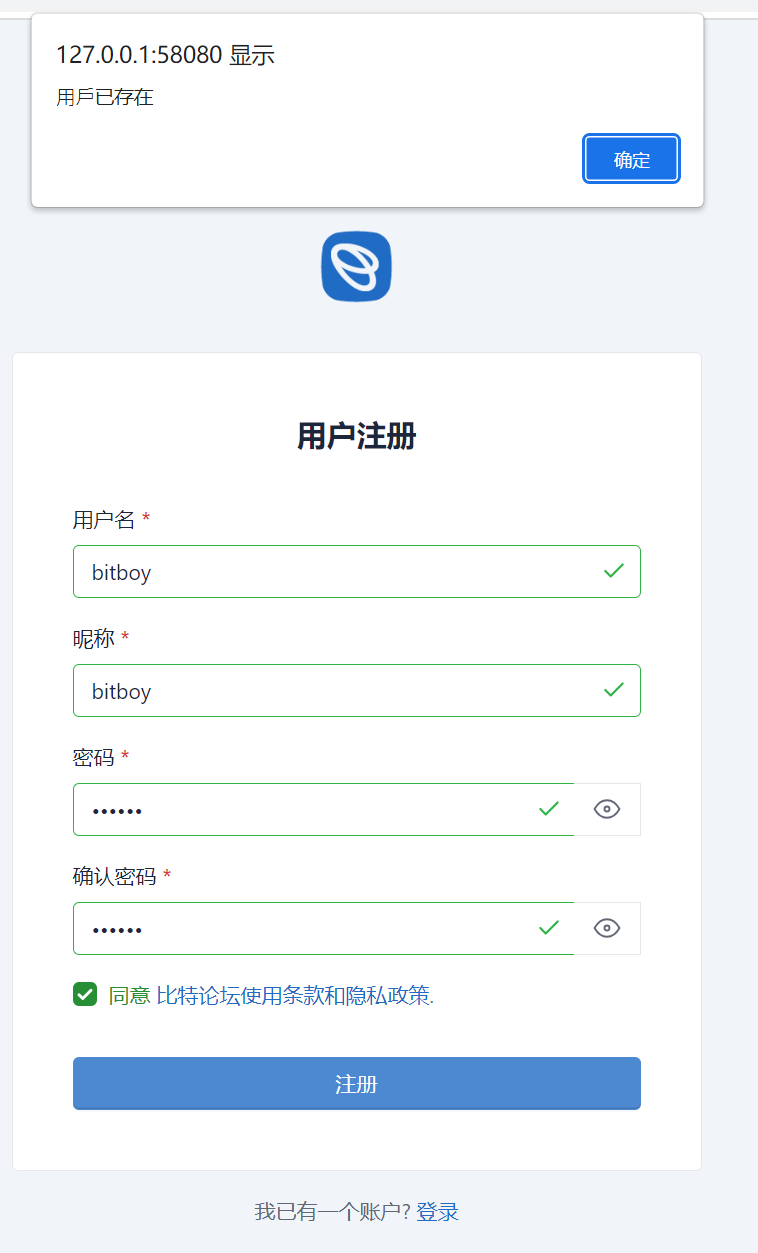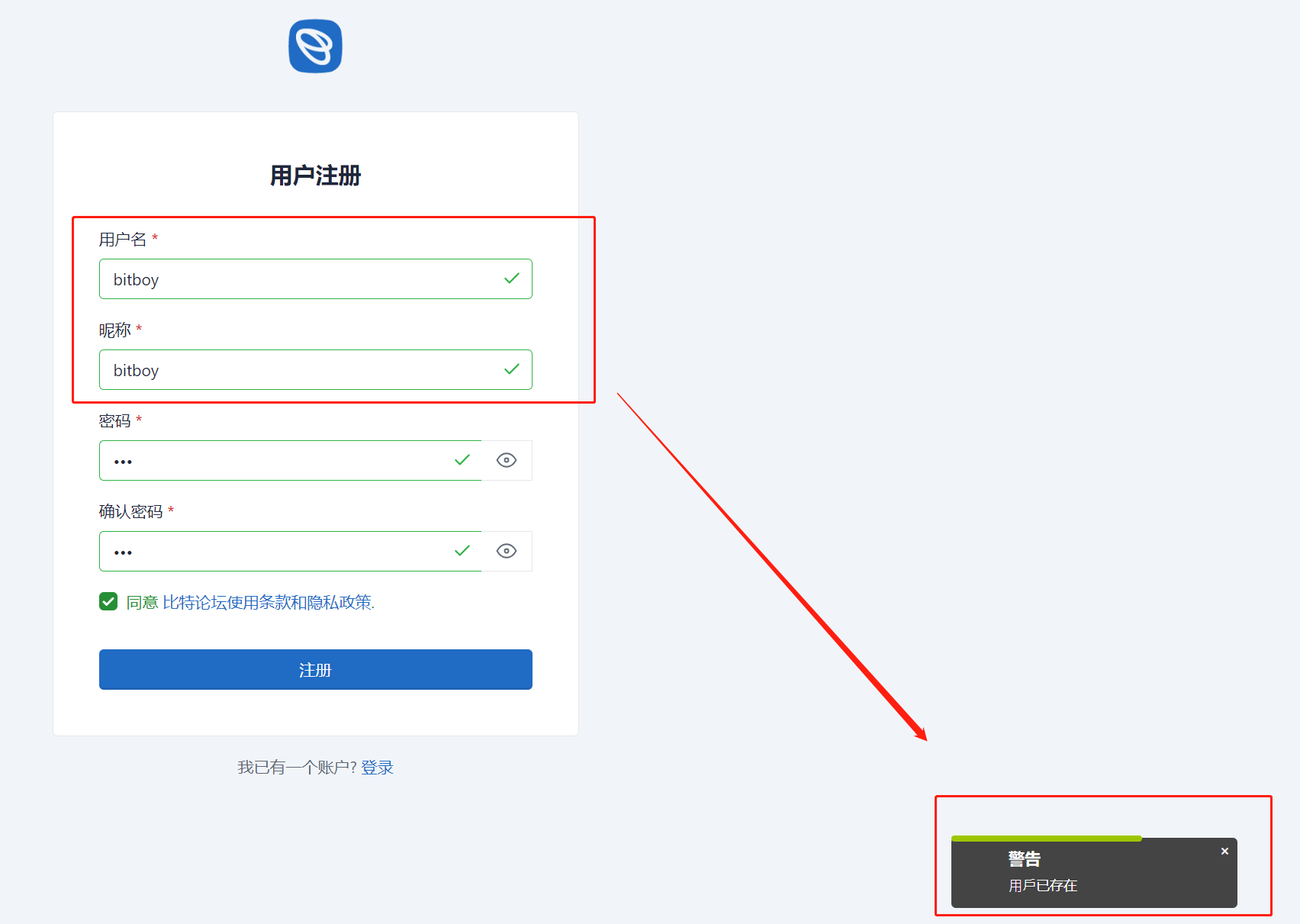 接下来我们打开注册界面,输入已有的用户名,可以看到提示框弹出: